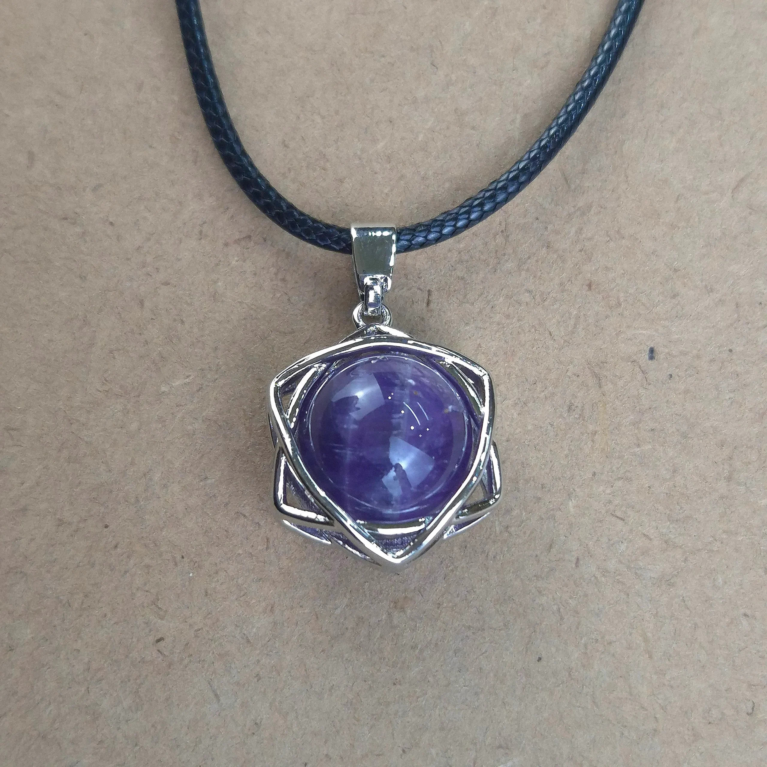 Piedra natural en forma de esfera, engarzada en estructura de acero quirurgíco con forma de estrella. Tamaño aproximado de 2cm. Incluye cordón de cuero sintético.