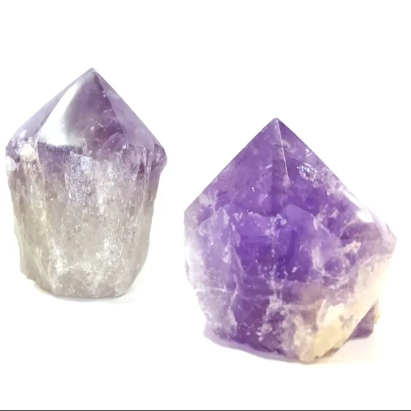 Piedra natural con base en bruto y parte superior pulida y facetada en punta con 6 caras aproximadamente. Tamaño aproximado de alto entre 6 y 10 cm, y con ancho de base entre 6 y 10 cm aproximadamente.