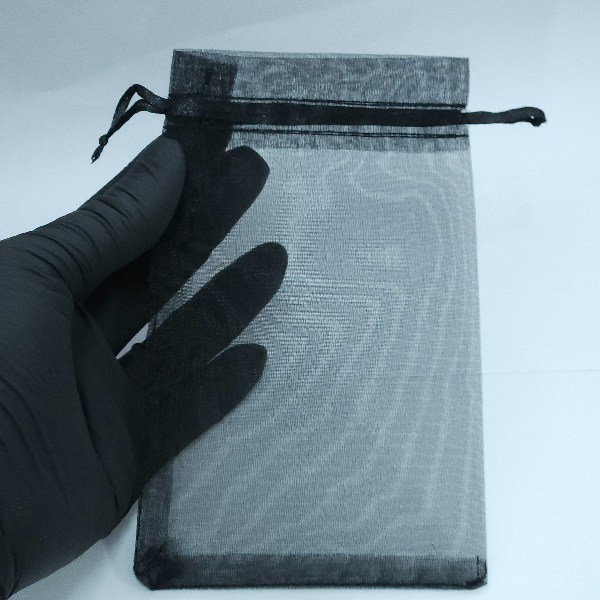 Bolsa negra de organza con cinta en ambos lados para abrir y cerrar facilmente. Medidas: 10 x 15 cm.