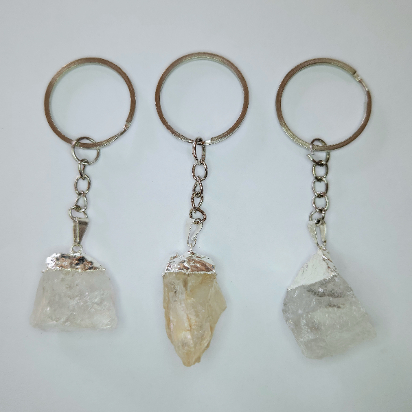 Piedra natural en bruto 3 a 4 cm aproximadamente, con engarce de electroplate y terminacion con cierre para llavero en acero quirurgico.