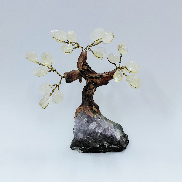 Piedras naturales roladas de tamaños entre 0,5 a 1 cm pegadas en estructura de masa formando un árbol de 6 ramas. Montado en una base de amatista en bruto.