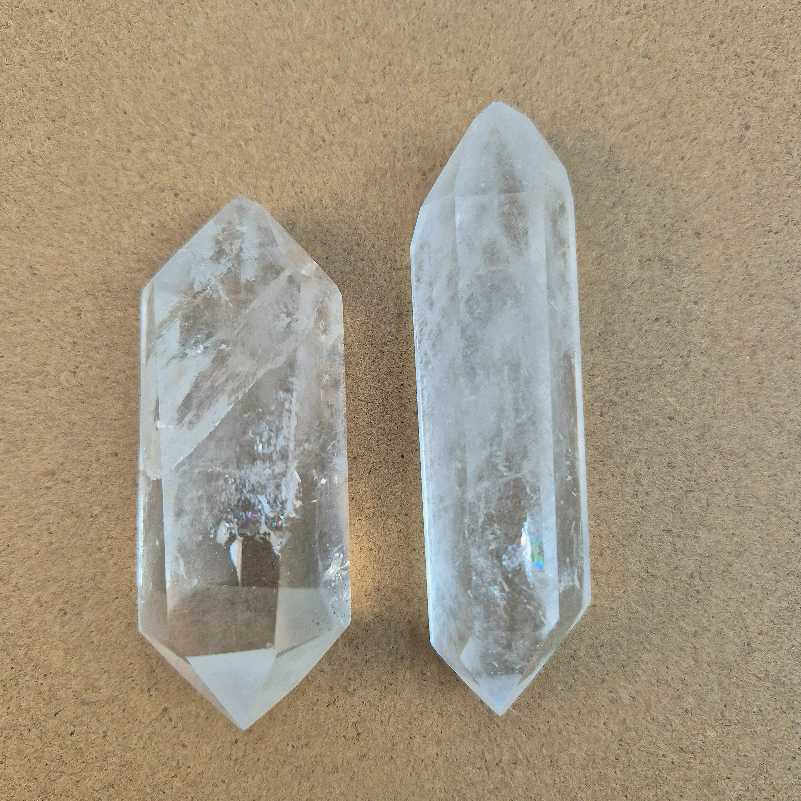 Piedra natural puliza y facetada en forma biterminada con 6 caras. Tamaño aproximado de largo entre 6 cm y 10 cm con un ancho entre 2,5 y 4 cm aproximadamente.