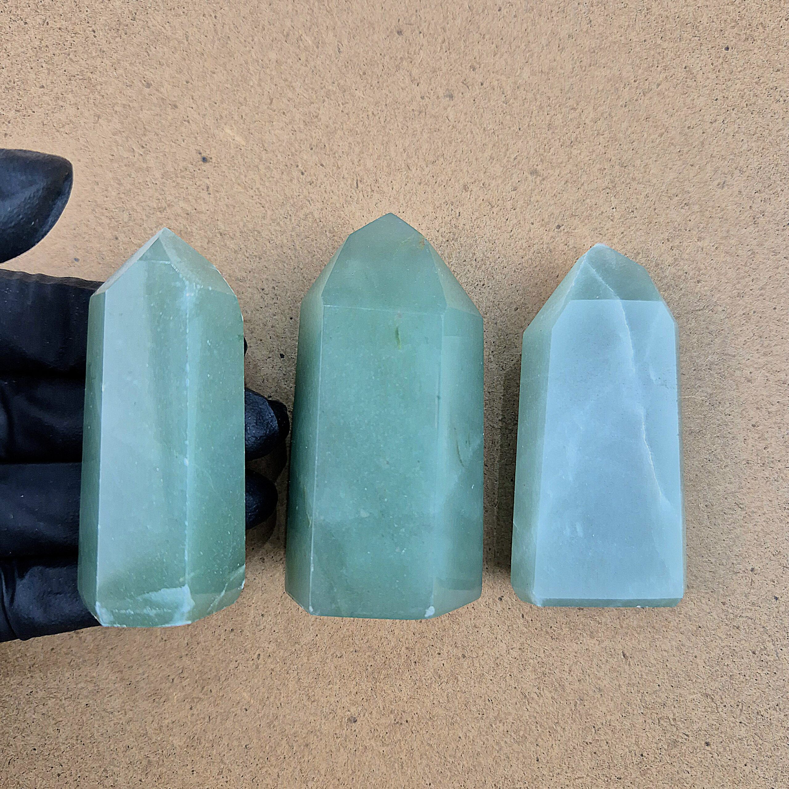 Piedra natural facetada y pulida con forma de obelisco. Con altura de 5 a 8 cm aproximadamente, y ancho de base de 2,5 a 4 cm aproximadamente.