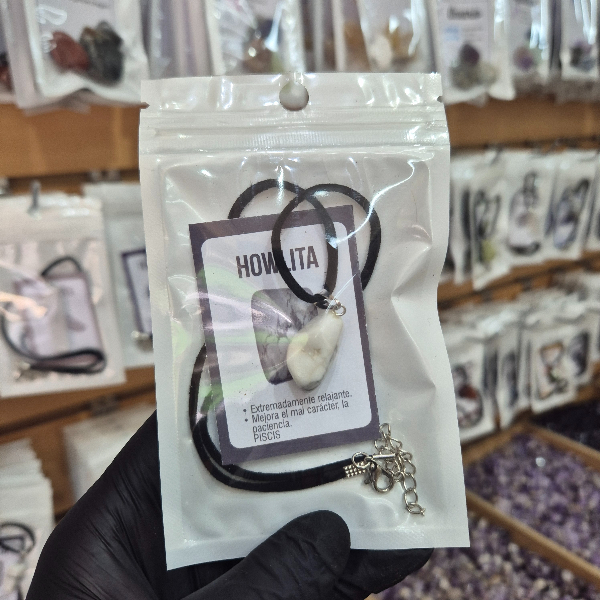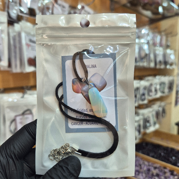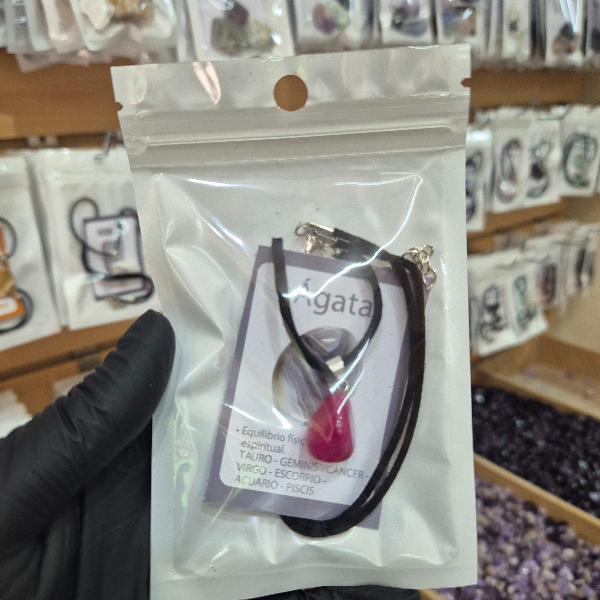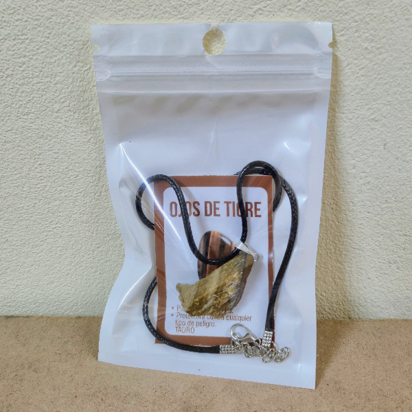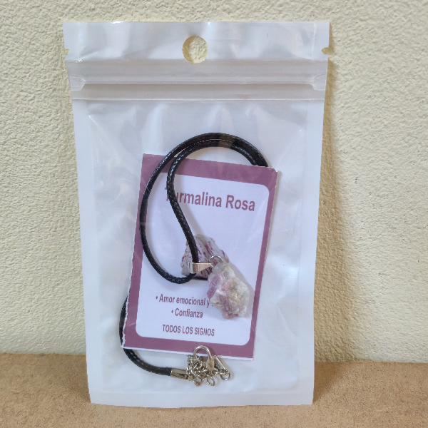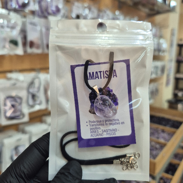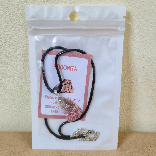 Piedra natural en bruto, perforada para dije, con cordón sintetico, incluye bolsa ziploc y tarjeta descriptiva.