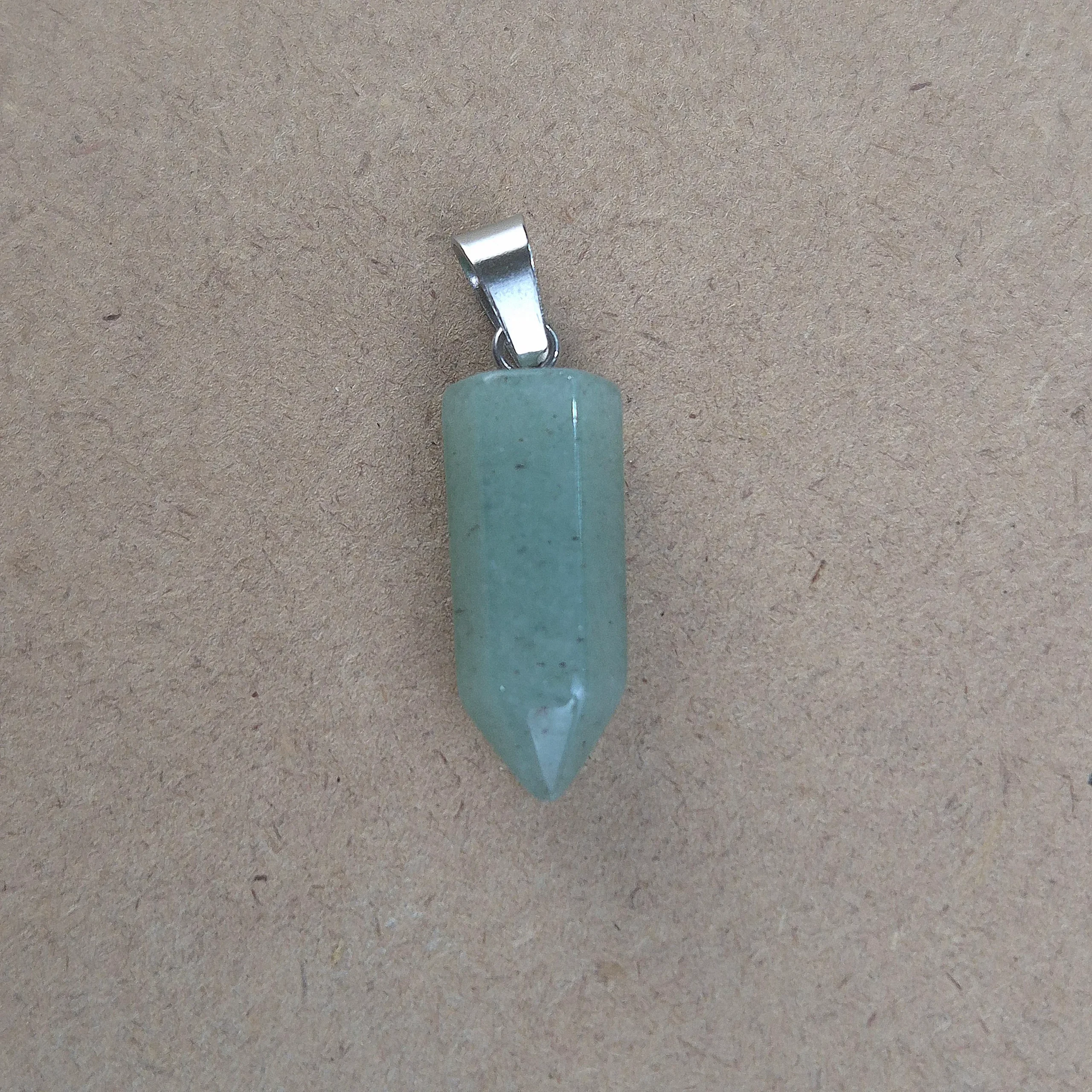 Piedra natural pulida y trabajada con forma de lapíz, perforada para dije con enganche de acero. Tamaño aproximado de diametro 2 cm.
