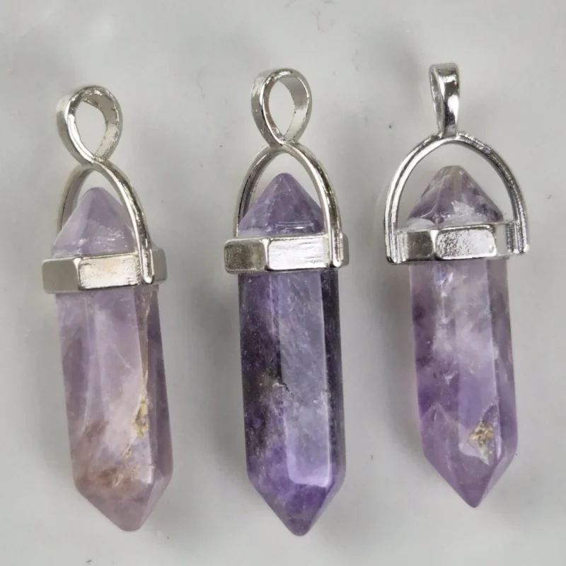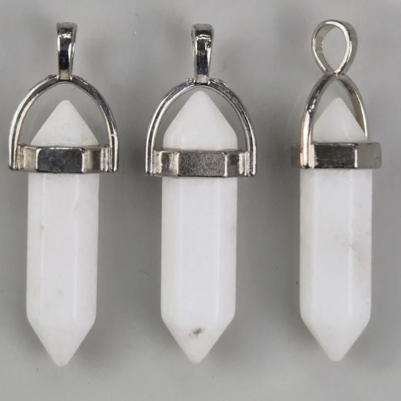 Piedra natural pulida y trabajada con forma hexagonal, con enganche de acero. Tamaño aproximado de 4cm.
