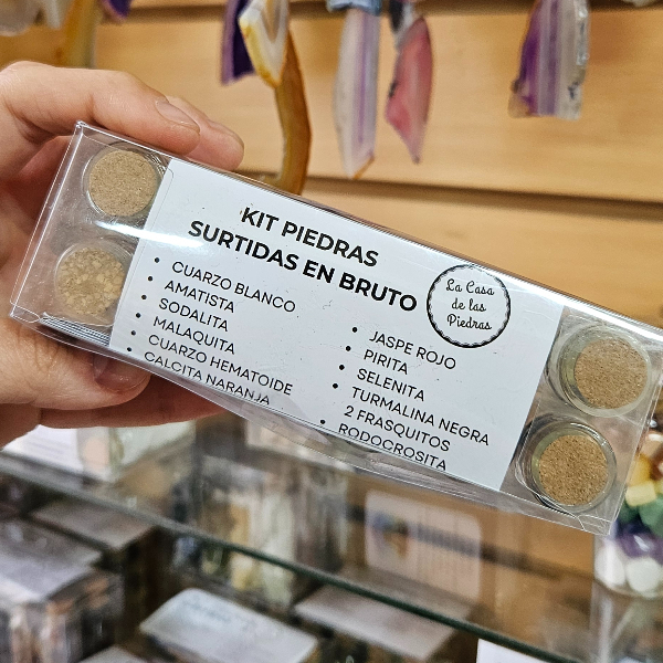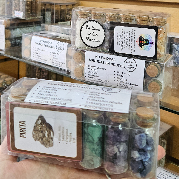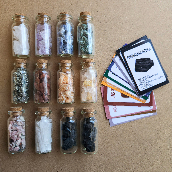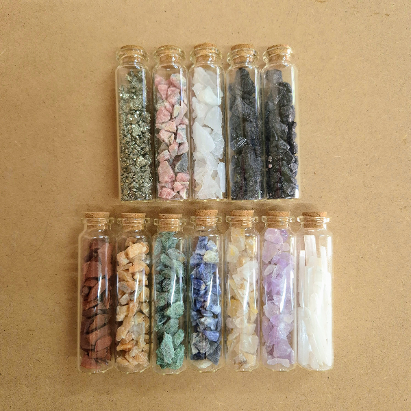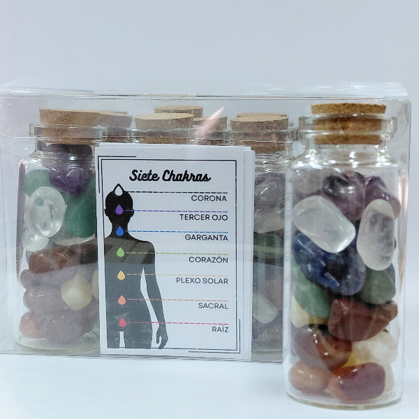 Contiene 12 frasquitos de vidrio de 7 cm con tapón de escarcha – El contenido de cada frasco es de las piedras naturales en bruto correspondientes a los colores de los 7 chakras.