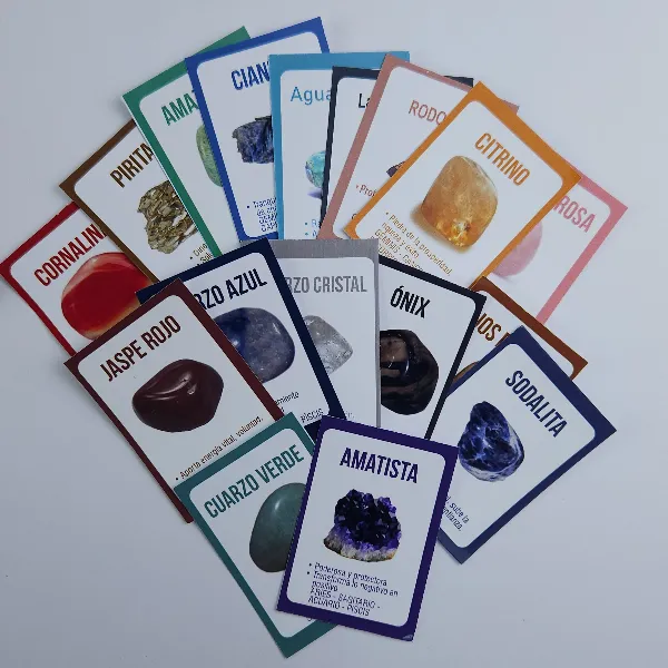Contiene piedra rolada o pulida – Tamaño de piedras desde 1 a 2 cm (Aprox) – 20 tipos de piedras diferentes, 200gr c/u. – Incluye tarjetas con información de cada piedra.