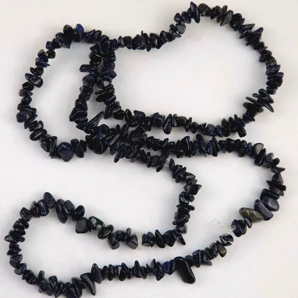 Piedra sintética, perforada y pulida con forma irregular. Tamaño aproximado de cada piedra 0,5 a 0,8 cm aprox. El largo del collar es de 85 cm aprox.