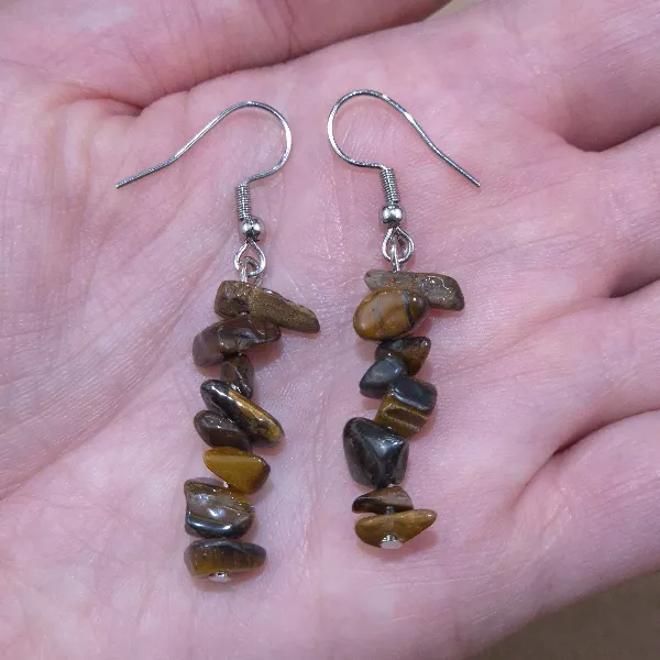 Piedras naturales pulidas en forma de escallas de 0,5 a 1 cm. Perforadas con terminacion de caravanas en acero quirurgíco.
