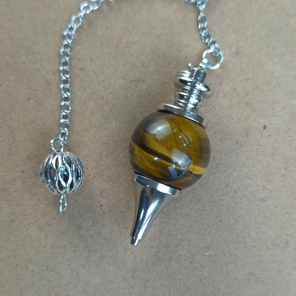 Piedra natural pulida con forma de esfera, engarzada en acero con forma de pendulo de 4cm. Incluye cadena de acero de 20 cm.