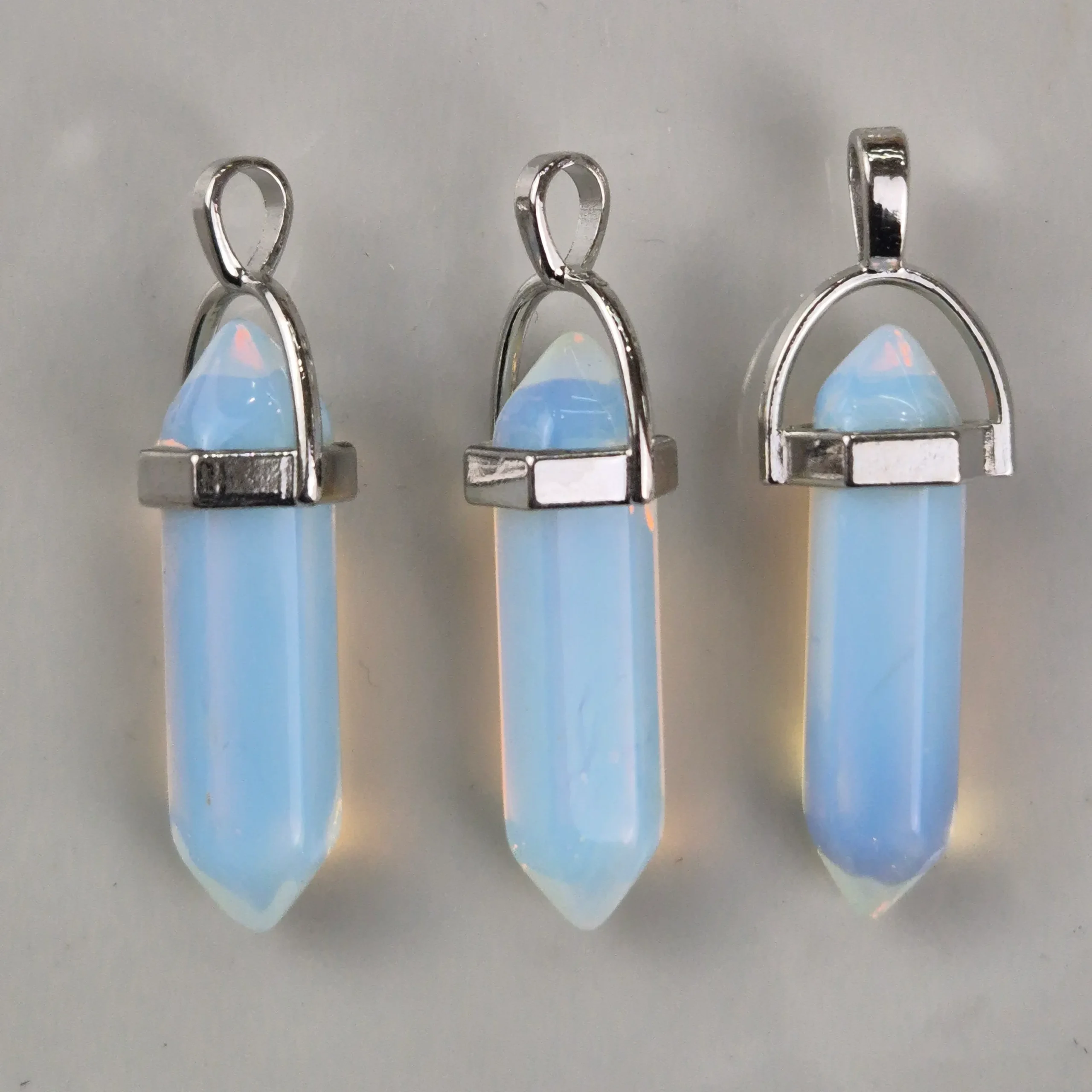 Piedra sintetica pulida y trabajada con forma hexagonal, con enganche de acero. Tamaño aproximado de 4cm.