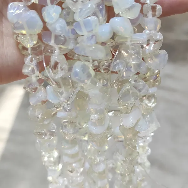 Piedra sintética, perforada y pulida con forma irregular. Tamaño aproximado de cada piedra 0,8 a 1,2 cm aprox. El largo del collar es de 85/90 cm aprox.
