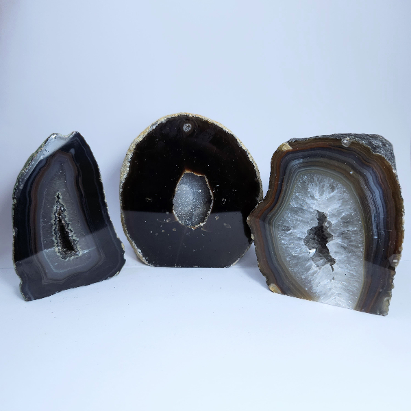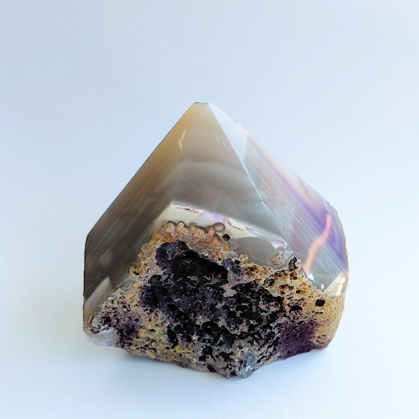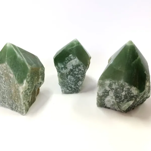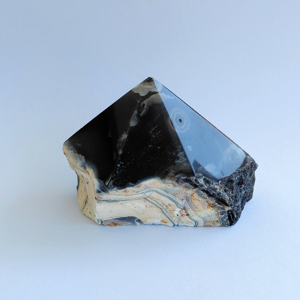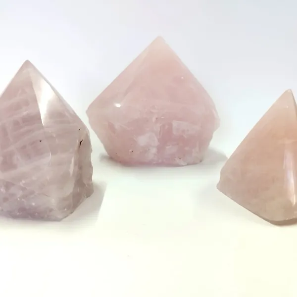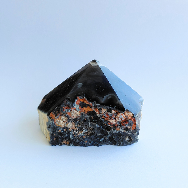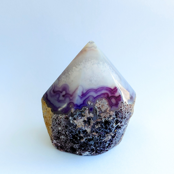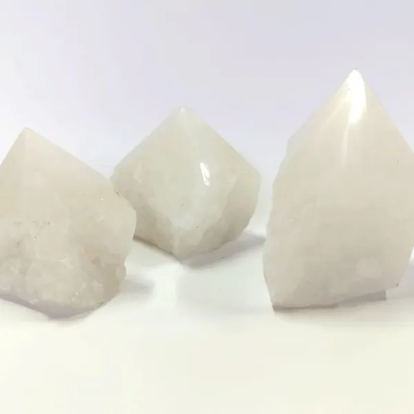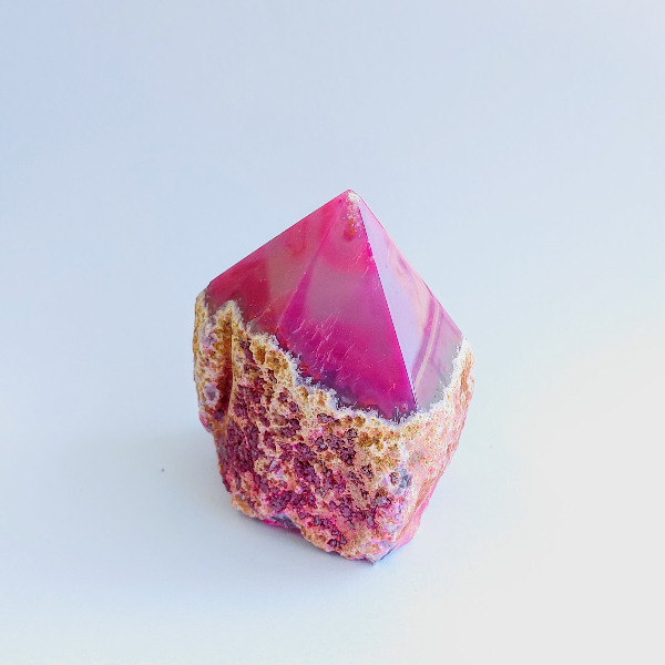 Piedra natural con base en bruto y parte superior pulida y facetada en punta con 6 caras aproximadamente. Tamaño aproximado de alto entre 6 y 10 cm, y con ancho de base entre 6 y 10 cm aproximadamente.