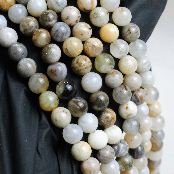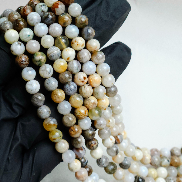 Tira de esferas perforadas de piedra natural con un diámetro de 6mm aprox. y un largo de 40/42 cm aprox. , contiene unas 60/70 esferas aproximadamente.