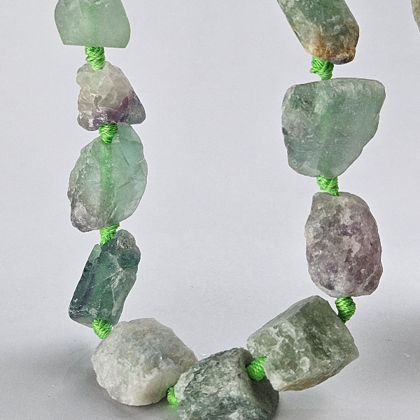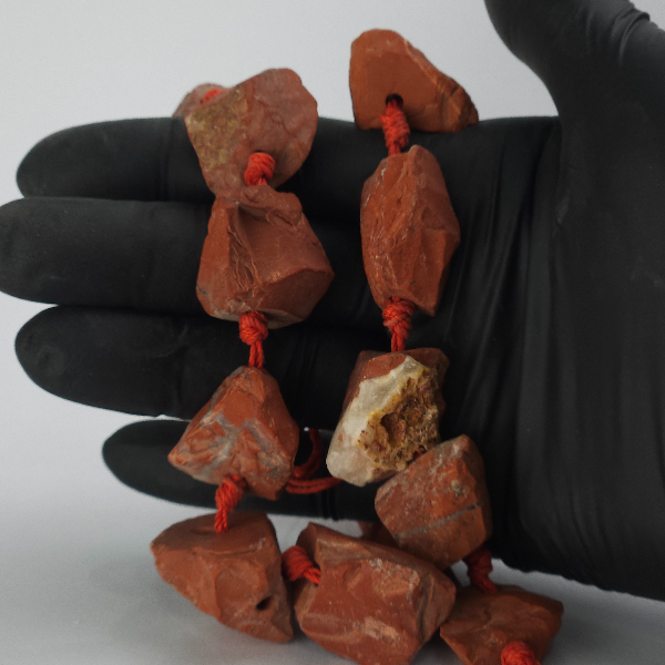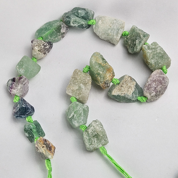 Piedra natural en bruto entre 2,5 y 3,5 cm cada una, perforadas. La tira contiene entre 18 y 20 piedras.